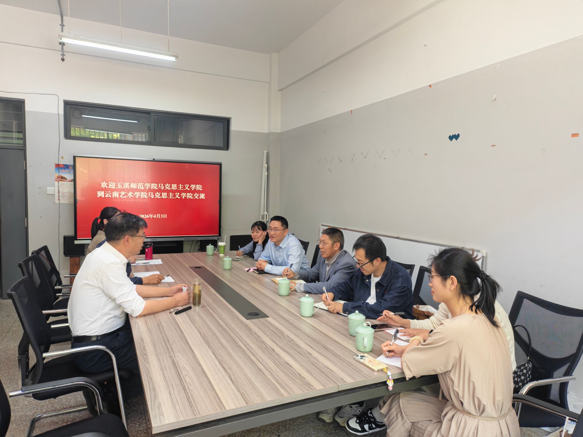 2026年4月3日,玉溪师范学院马克思主义学院党委书记罗辉带队赴云南艺术学院马院开展学习交流。此次交流聚焦党建引领、学科专业建设、思想政治理论课教学改革以及“大思政课”实践教学基地建设管理方面的经验,共同探讨新时代高校思政课改革创新路径。交流会由我校马克思主义学院党总支书记李三强主持。